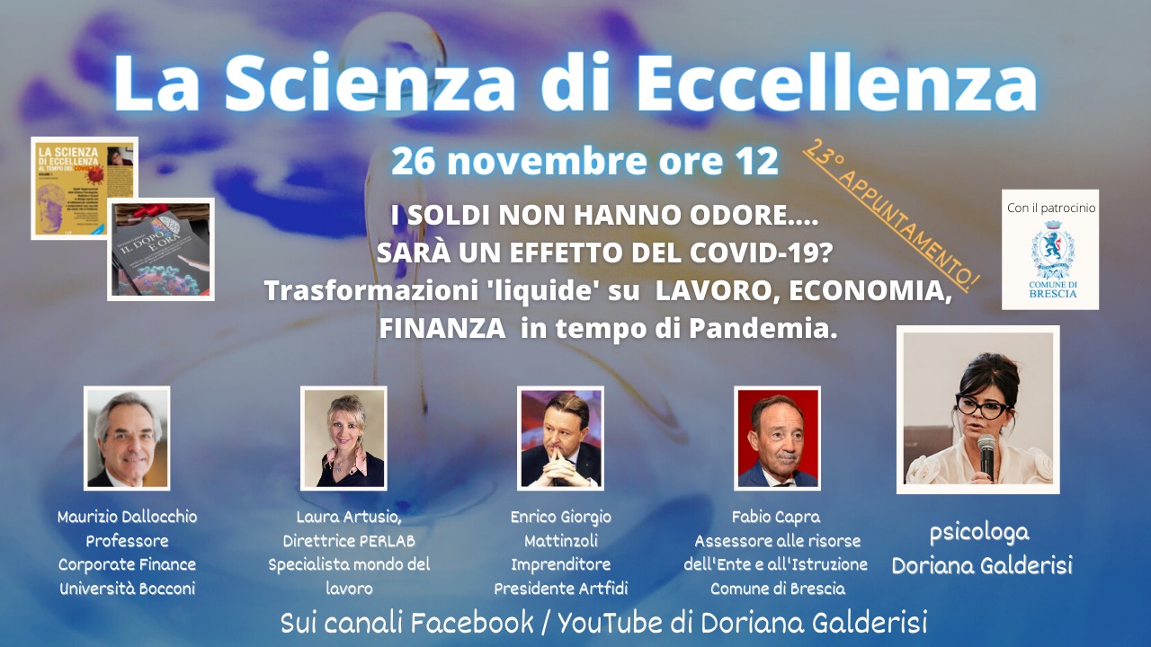 WEBINAR 26 NOVEMBRE ORE 12 "LA SCIENZA DI ECCELLENZA" Facebook www.facebook.com/psicologadorianagalderisi/ Youtube www.youtube.com/channel/UCy0hBwKJ4DuXXmCl_uivkjA CONDIVIDI: